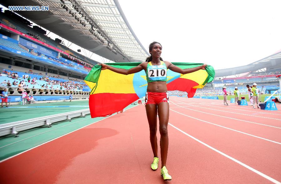 Gold Medalist Kokeb Tesfaye Alemu of Ethiopia holding her national flag, celebrates after the Women’s 1500m Final of athletics event at the Nanjing 2014 Youth Olympic Games in Nanjing, capital of east China's Jiangsu Province, Aug. 25, 2014. (Xinhua/Liao Yujie)
