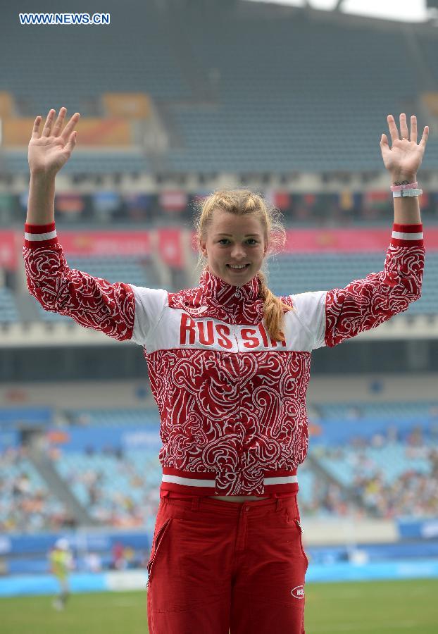 Gold medalist Alena Bugakova of Russian Federation poses on the podium during the awarding ceremony of the Women’s Shot Put of athletics event at the Nanjing 2014 Olympic Games in Nanjing, capital of east China's Jiangsu Province, Aug. 25, 2014. (Xinhua/Chen Cheng)