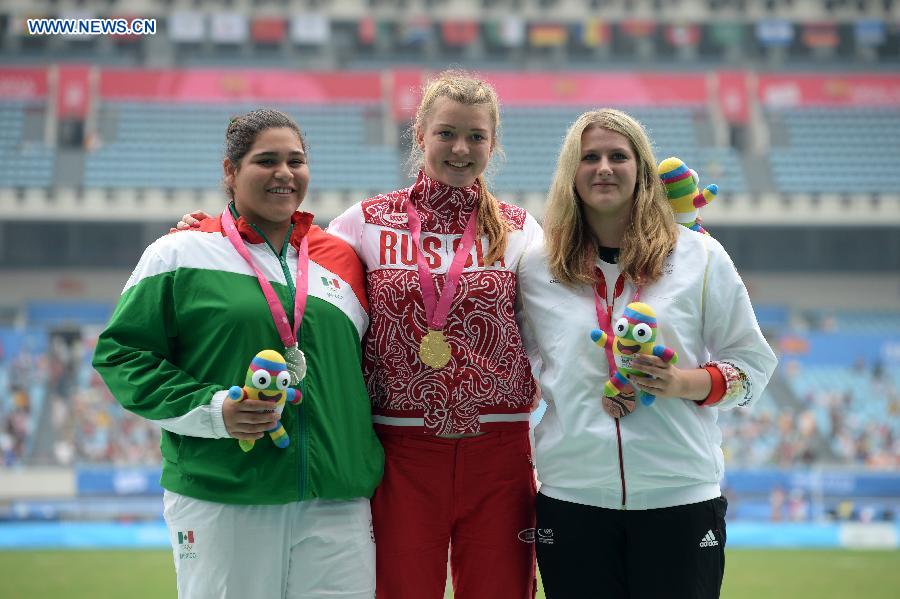 Gold medalist Alena Bugakova (C) of Russian Federation, silver medalist Maria Fernanda Orozco Castro (L) of Mexico and bronze medalist Anika Nehls of Germany pose on the podium during the awarding ceremony of the Women’s Shot Put of athletics event at the Nanjing 2014 Olympic Games in Nanjing, capital of east China's Jiangsu Province, Aug. 25, 2014. (Xinhua/Chen Cheng)