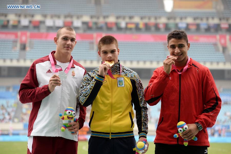 Gold medalist Hlib Piskunov (C) of Ukraine, silver medalist Bence Halasz (L) of Hungary and bronze medalist Ahmed Youssef of Egypt pose on the podium during the awarding ceremony of the Men’s Hammer Throw of athletics event at the Nanjing 2014 Youth Olympic Games in Nanjing, capital of east China's Jiangsu Province, Aug. 25, 2014. (Xinhua/Chen Cheng)