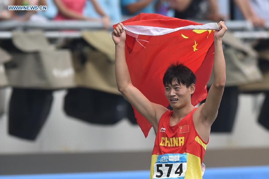 Gold Medalist Xu Zhihang of China holding the national flag of China, celebrates after the Men’s 400m Hurdles Final of athletics event at the Nanjing 2014 Youth Olympic Games in Nanjing, capital of east China's Jiangsu Province, Aug. 25, 2014. (Xinhua/Guo Cheng)