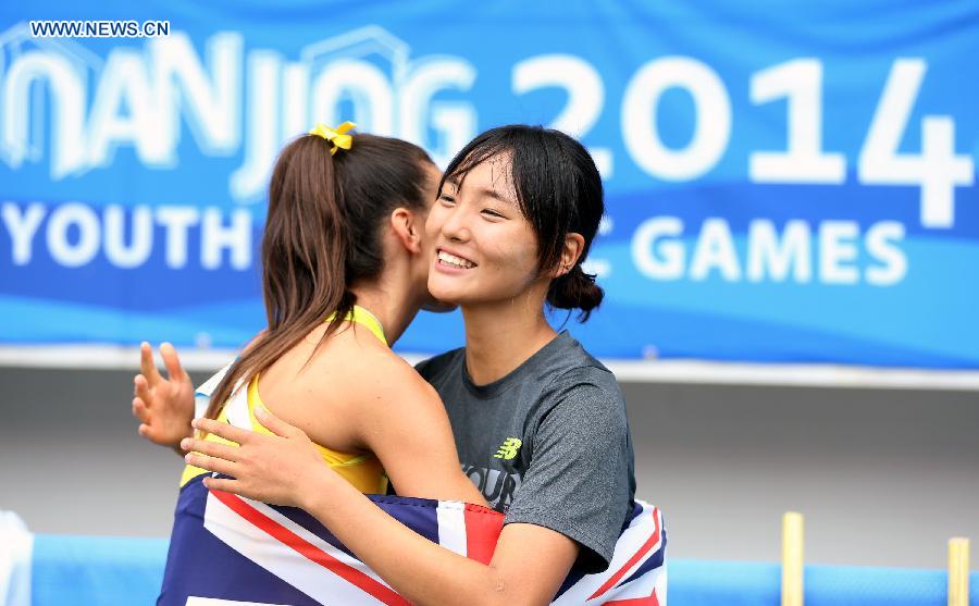Silver medalist Tay-Leiha Clark (L) of Australia embraces Hyeonjeong Lee of South Korea after the Women’s Triple Jump of athletics event at the Nanjing 2014 Youth Olympic Games in Nanjing, capital of east China's Jiangsu Province, Aug. 25, 2014. (Xinhua/Liao Yujie)