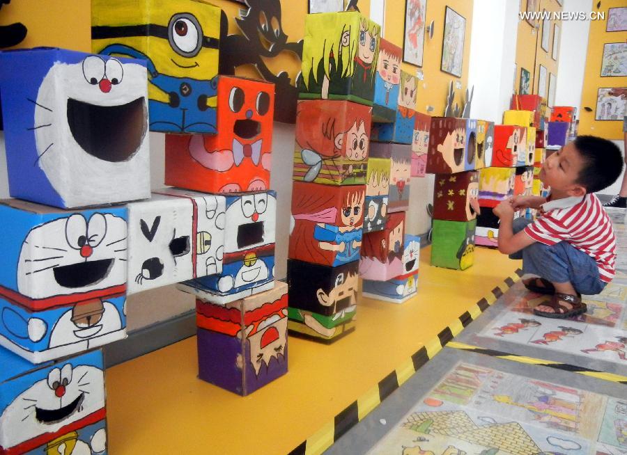 A young visitor looks at artworks made with recycled materials during the First Suzhou International Children's Visual Arts Biennial Exhibition in Suzhou, east China's Jiangsu Province, Aug. 24, 2014. Over 1,000 visual artworks done by kids around the world will be shown during the First Suzhou International Children's Visual Arts Biennial Exhibition, which is available from Aug. 23 to Sept. 14 in Suzhou. (Xinhua/Wang Jiankang)