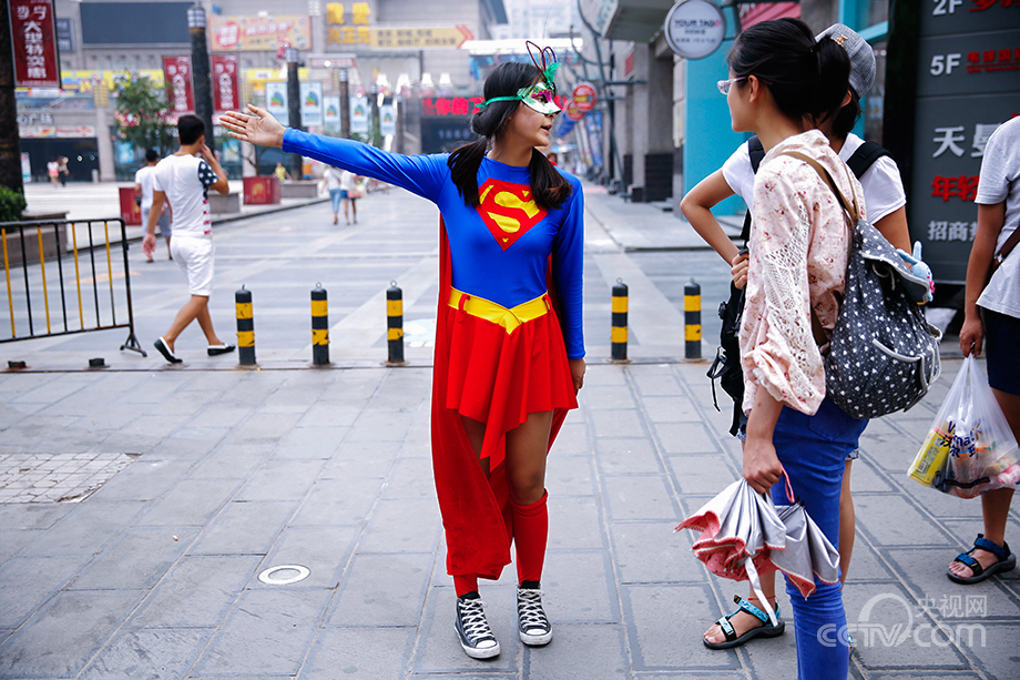 A 'superwoman' provides helps to the tourists in a street of Xi'an on July 24, 2013. The 'superwoman' is a college student who wants to spend her holidays to help people. "The reason that I am dressed as 'superwoman' is to catch the attention of the people who may need my help."(Photo/CNTV)