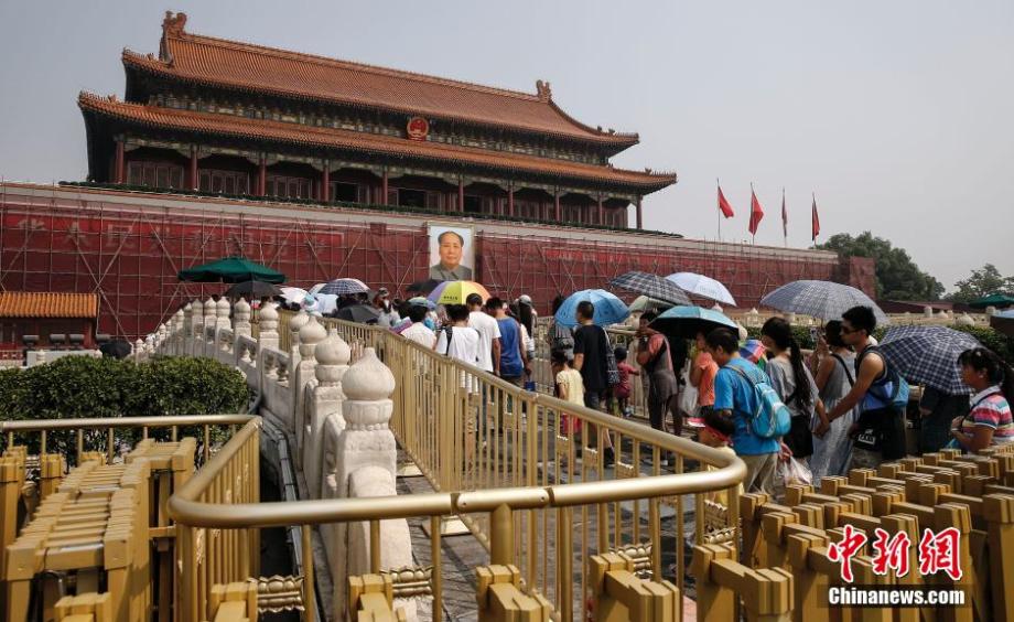 To embrace the 65th founding anniversary of People's Republic of China, Tiananmen, the famous monument and national symbol in Beijing, is ready for repaint and repairs on Aug. 20, 2014. (Photo/CNS)