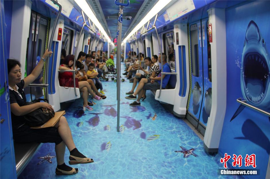 Sea World 3D subway train in Ningbo had its first run, Aug. 22, 2014. The inside of the train was decorated with 3D marine pictures. Walking inside the train was like being in a beautiful sea world. Ningbo is a modern port city in east China. A train of sea world theme helps highlight the distinguishing features of the city.