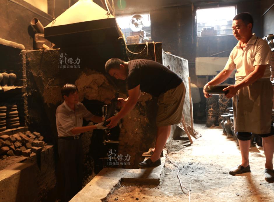 Black pottery is drawn out of kiln after being fired. (iqilu.com/Zhang Qiling)
