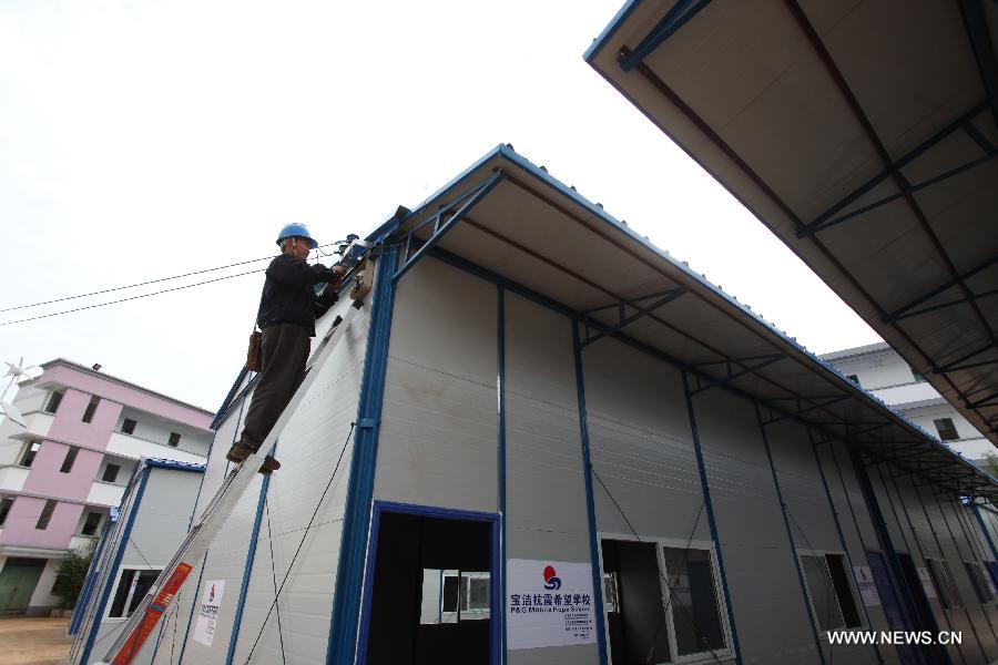 | Make-shift classrooms are set up for students to start their new semester at a hope school in the quake-hit Baogunao Township, Qiaojia County, south China's Yunnan Province, Aug. 25, 2014. (Xinhua/Zhang Guangyu) |