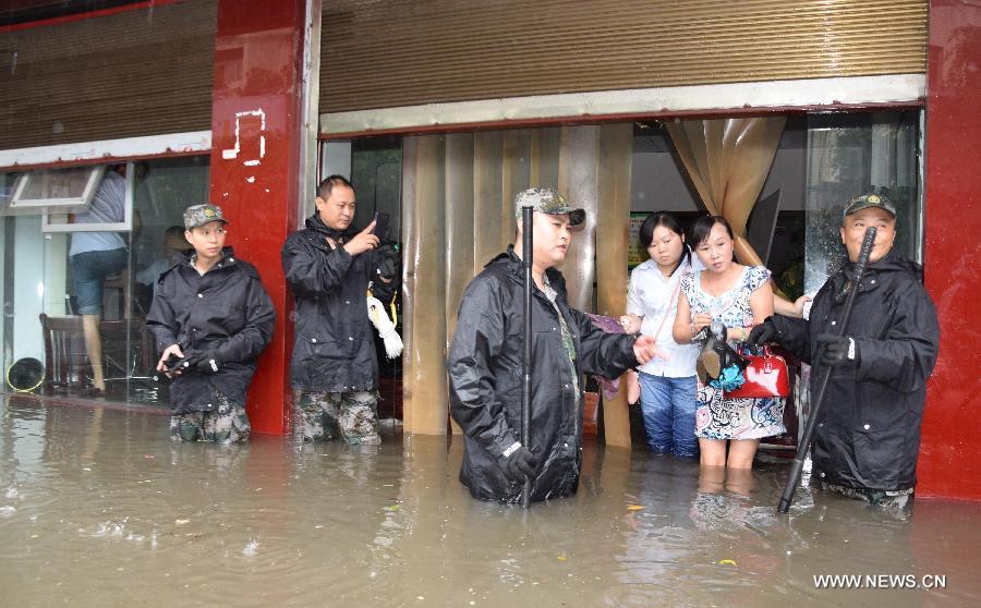 Rescuers try to transfer trapped people on a flooded road in Yuechi County of Guang'an City, southwest China's Sichuan Province, Aug. 26, 2014. A rainstorm hit the county on Tuesday, causing a serious urban waterlogging. (Xinhua/Hu Zuobin)