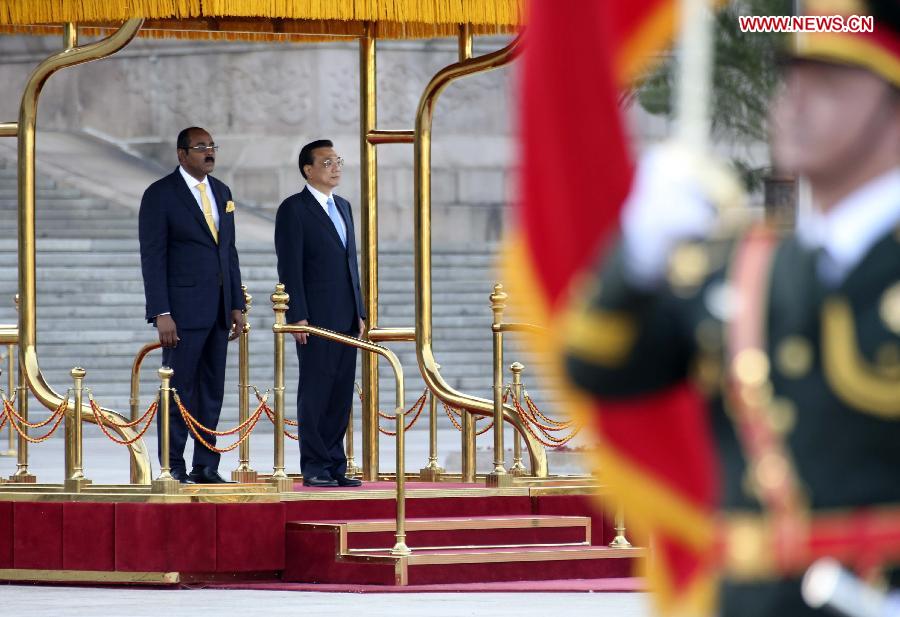 | Chinese Premier Li Keqiang (2nd L) holds a welcome ceremony for Antigua and Barbuda Prime Minister Gaston Browne in Beijing, China, Aug. 26, 2014. (Xinhua/Ding Lin) |