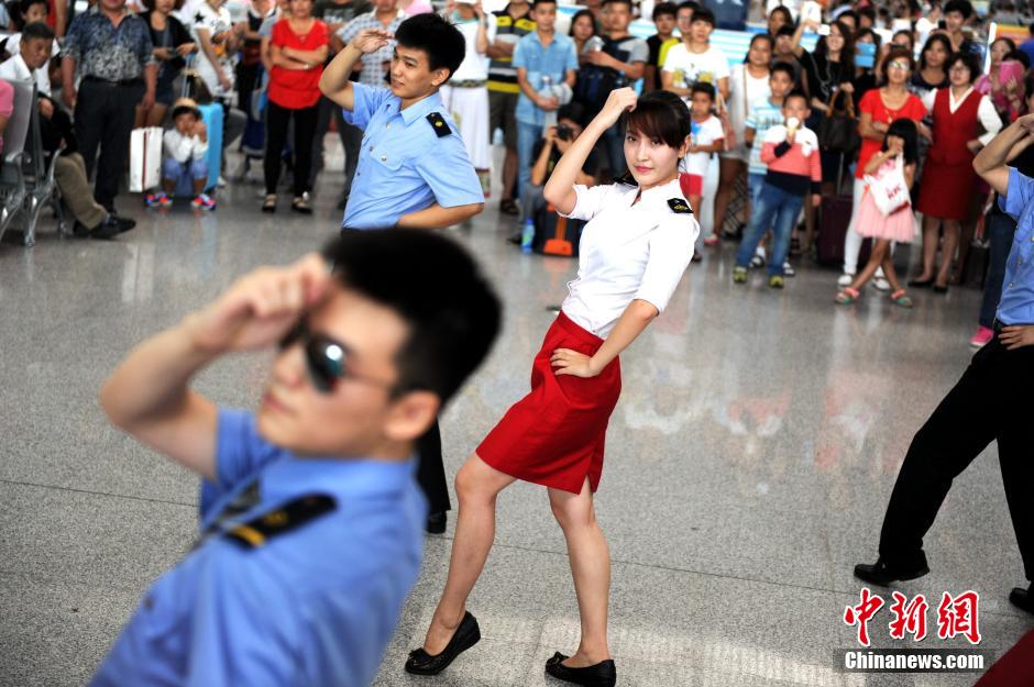 The stewards at Xi'an North Railway Station dance to "Little Apple" to welcome the passengers on Aug. 21, 2014, in Xi'an, northwest China's Shaanxi province. By the Chopsticks Brothers, "Little Apple" is one of the most popular songs in China. (Photo/CNS)