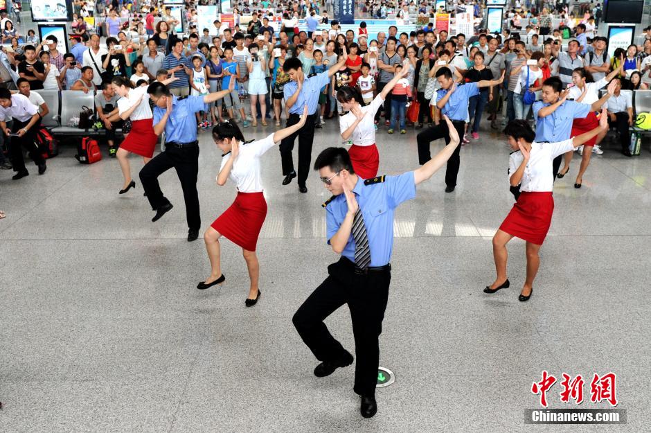 The stewards at Xi'an North Railway Station dance to "Little Apple" to welcome the passengers on Aug. 21, 2014, in Xi'an, northwest China's Shaanxi province. By the Chopsticks Brothers, "Little Apple" is one of the most popular songs in China. (Photo/CNS)