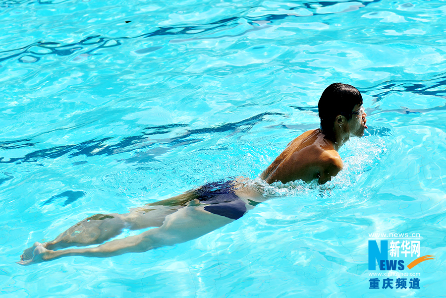Wang Hu takes swim training in the swimming pool of Southwest University in Chongqing on Aug. 21, 2014. (Photo/Xinhua)