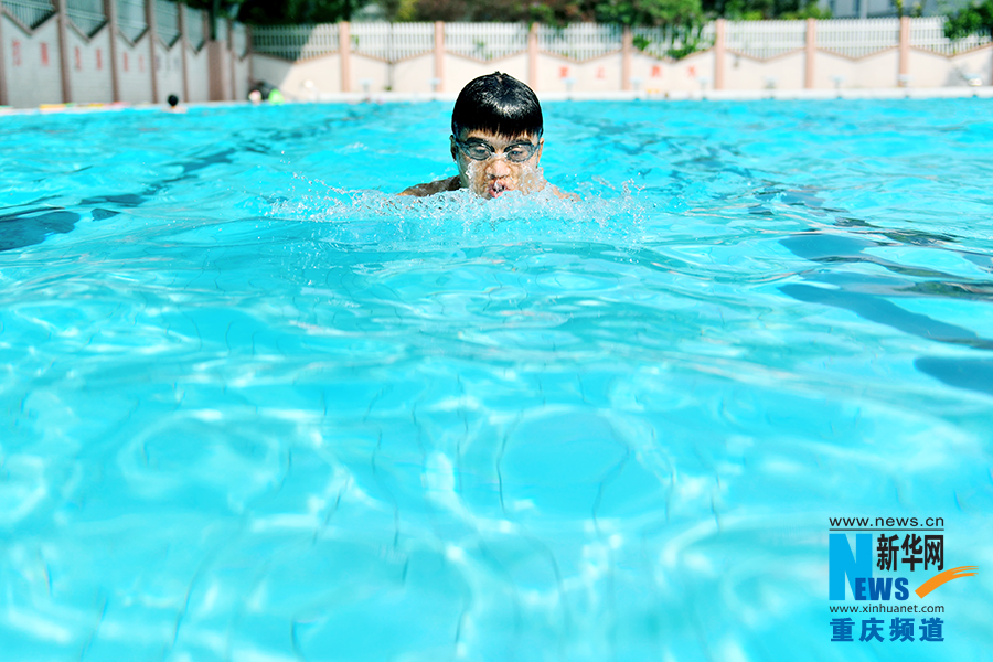Wang Hu takes swim training in the swimming pool of Southwest University in Chongqing on Aug. 21, 2014. (Photo/Xinhua)