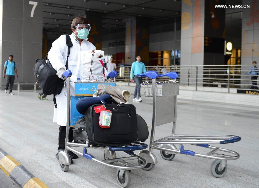 | A passenger, who did not pass the preliminary screening for the Ebola virus, leaves the Delhi International Airport to Ram Manohar Lohia Hospital for further medical checkup on Aug. 26, 2014. India is on high alert as passengers from Ebola-hit countries in Africa need to be screened for the virus upon their arrival. (Xinhua/Partha Sarkar) |