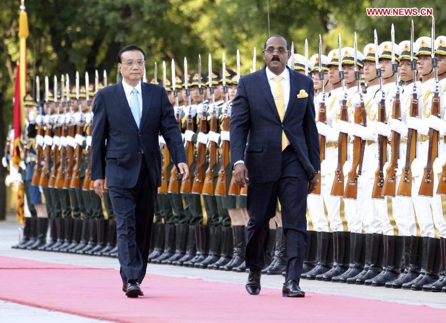 Chinese Premier Li Keqiang (L) holds a welcome ceremony for Antigua and Barbuda Prime Minister Gaston Browne in Beijing, China, Aug. 26, 2014. (Xinhua/Ding Lin)