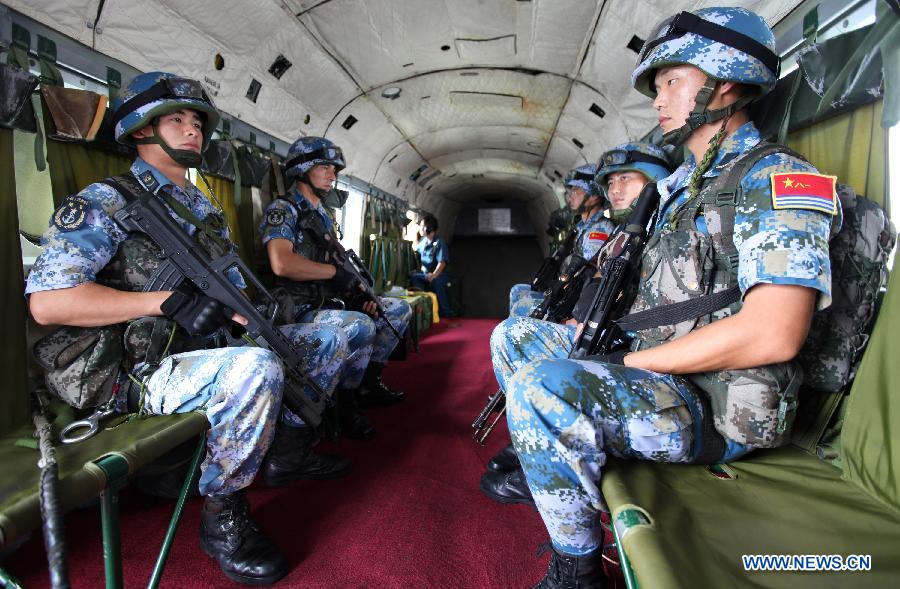 | Chinese Navy soldiers sit in formation on a helicopter during an escort mission in the Gulf of Aden, Aug. 26, 2014. This is the 18th convoy fleet sent by the Chinese People's Liberation Army Navy for these missions since 2008. (Xinhua/Zhang Yuelin) |