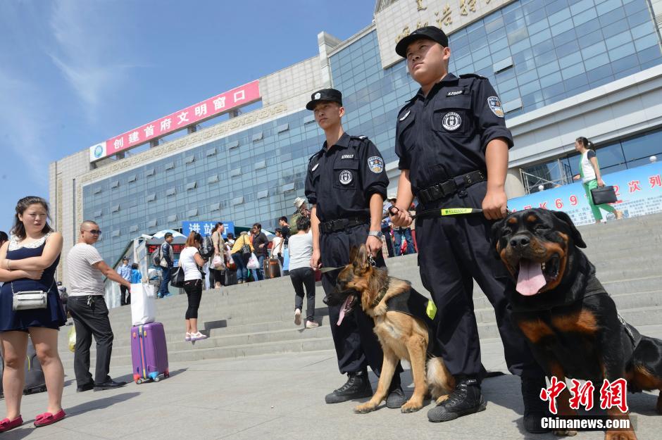 Two police dogs are on duty, searching for prohibited materials in the square of the railway station in Hohhot, capital of Inner Mongolia Autonomous Region on Aug. 26, 2014. Recently, 19 German shepherd dogs joined the police dog training team in the city. The police dogs have joined routine patrols in densely-populated areas. They are expected to help the police deal with terrorist attacks and keep order in large-scale gatherings. (China News Service/Liu Wenhua)