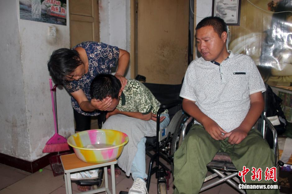 To reduce burdens of their 52-year-old mother, the brothers always refuse to do face cleaning and mouth washing. They asked her to help them do so just before the reporters came to interview them. (China News Service/ Ma Yiheng)