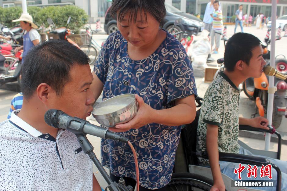 Rushing to the performance venue every day and having no time to eat, Lu Aimei has to cook noodle soup ready and spoon-feed her sons at the break of the performance. (China News Service/ Ma Yiheng)