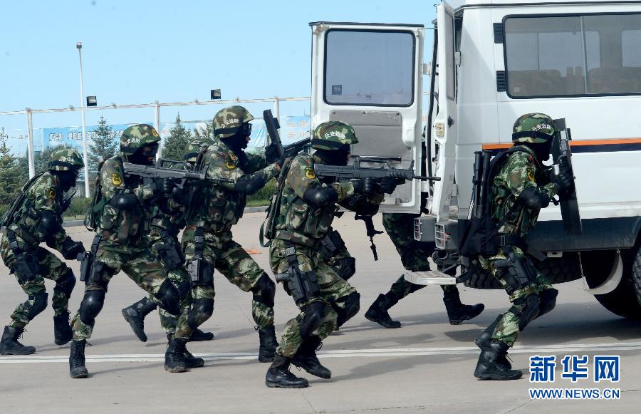 The frontier soldiers attack the car of the "terrorist suspects" in the drill on Aug. 26, 2014. (Xinhua/Wang Xiaoxue)
