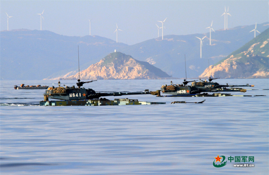 A team of amphibious armored vehicles launches an attack. (China Military Online/Liao Zhiyong)