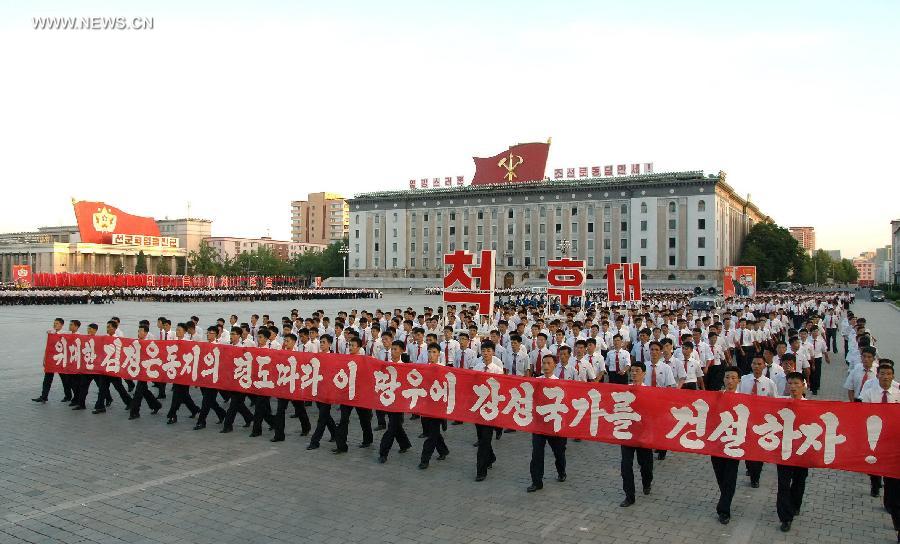 Photo provided by Korean Central News Agency (KCNA) on Aug. 27, 2014 shows members of the young vanguard attend a grand march at the Kim Il Sung Stadium, Pyongyang, the Democratic People's Republic of Korea (DPRK), to celebrate the Youth Day which falls on Aug. 28. (Xinhua/KCNA)