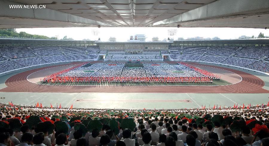 Photo provided by Korean Central News Agency (KCNA) on Aug. 27, 2014 shows members of the young vanguard attend an oath-taking ceremony at the Kim Il Sung Stadium, Pyongyang, the Democratic People's Republic of Korea (DPRK), to celebrate the Youth Day which falls on Aug. 28. (Xinhua/KCNA)