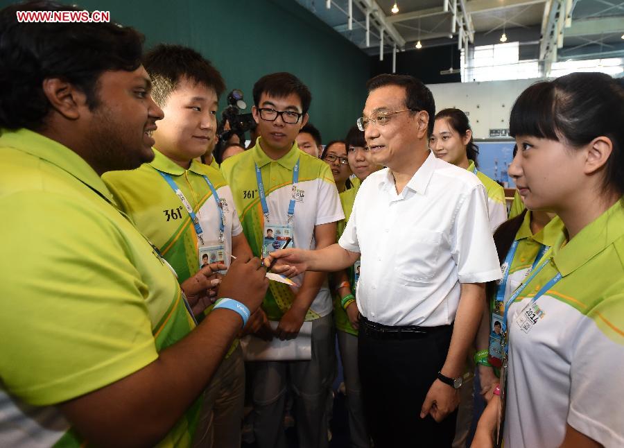Chinese Premier Li Keqiang talks to volunteers of the second Summer Youth Olympic Games during a visit in Nanjing, capital of east China's Jiangsu Province, Aug. 28, 2014. Li Keqiang is to attend the closing ceremony of the second Summer Youth Olympic Games Thursday in Nanjing. (Xinhua/Ma Zhancheng)