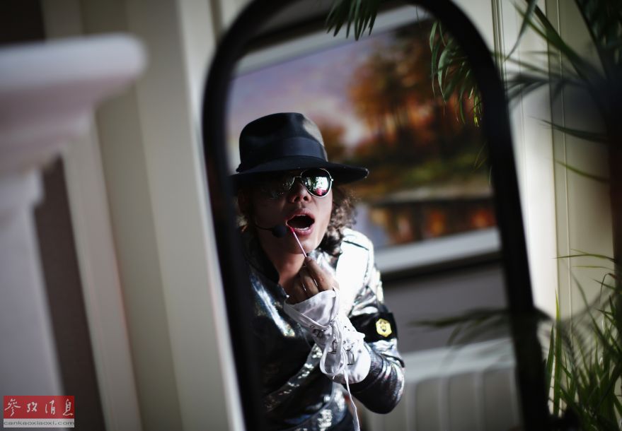 Zhang Guanhui, imitating Michael Jackson, checks his make-up as he prepares for his performance, in a dressing room in Langfang, Hebei province July 19, 2014. (Photo: cankaoxiaoxi.com)