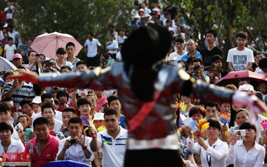 | Zhang Guanhui, impersonating Michael Jackson, dances during his street performance in Beijing August 20, 2014. Zhang, born in 1984, quit elementary school and has since held jobs as a factory worker, waiter, and security guard. After watching a Michael Jackson music video four years ago for the first time, Zhang says he became fascinated and now puts on shows on the street and small stages impersonating the King of Pop. (Photo: cankaoxiaoxi.com) |