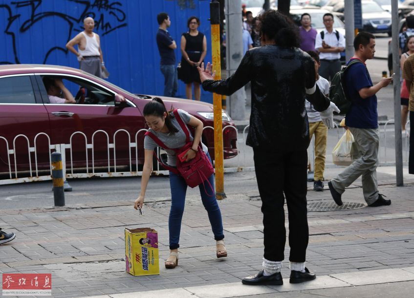 A bystander puts a money into a box after watching a street performance by Zhang Guanhui, impersonating Michael Jackson, in Beijing August 20, 2014.(Photo: cankaoxiaoxi.com)
