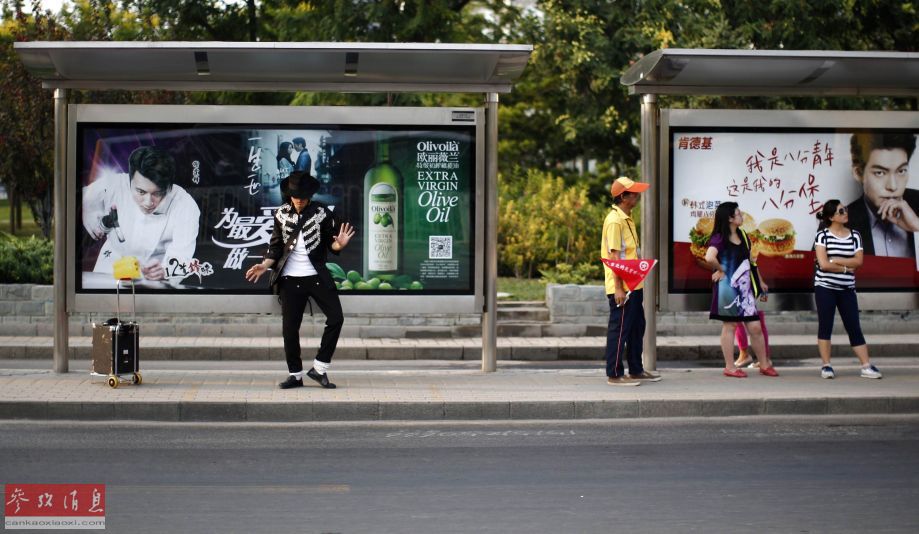 Zhang Guanhui, impersonating Michael Jackson, dances during his street performance in Beijing August 20, 2014. Zhang, born in 1984, quit elementary school and has since held jobs as a factory worker, waiter, and security guard. After watching a Michael Jackson music video four years ago for the first time, Zhang says he became fascinated and now puts on shows on the street and small stages impersonating the King of Pop. (Photo: cankaoxiaoxi.com)