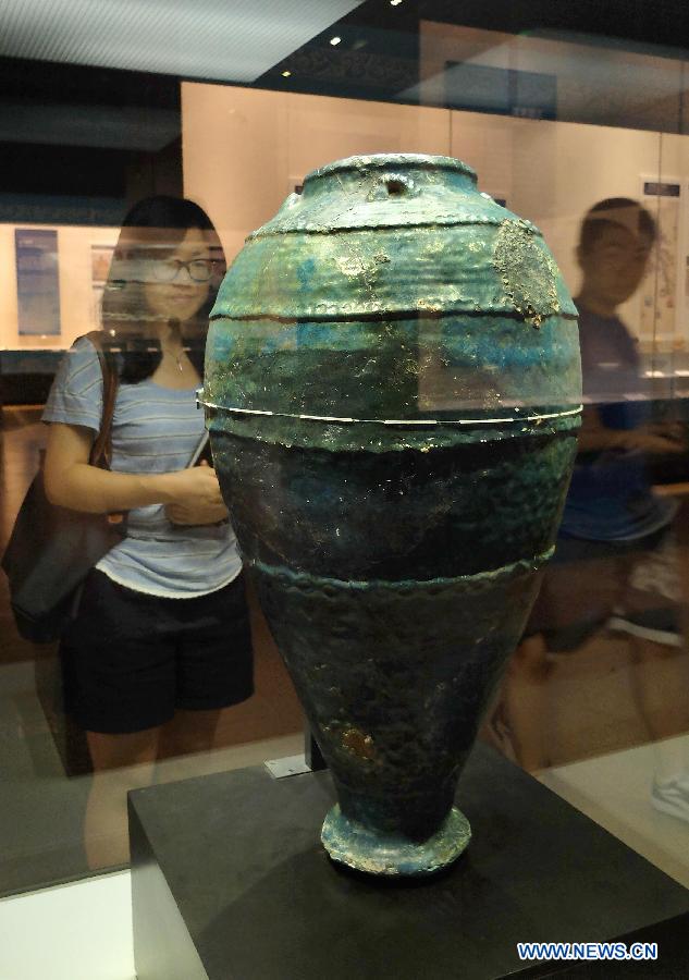 Visitors watch a displayed pottery from Ancient Persian Empire during an antique exhibition of the Maritime Silk Road in Jinan, capital of east China's Shandong Province, Aug. 28, 2014. The exhibiton, displaying some 300 antiques related to the Maritime Silk Road, opened here Thursday. (Xinhua/Xu Suhui)