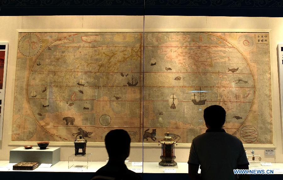 Visitors watch a reproduction of a map of Ming Dynasty (1368-1644) during an antique exhibition of the Maritime Silk Road in Jinan, capital of east China's Shandong Province, Aug. 28, 2014. The exhibiton, displaying some 300 antiques related to the Maritime Silk Road, opened here Thursday. (Xinhua/Xu Suhui)