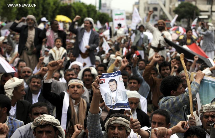 | Yemeni anti-government protesters shout slogans during a mass rally in Sanaa, Yemen, on Aug. 29, 2014. Hundreds of thousands of pro- and anti-government Yemenis staged demonstrations across the country on Friday, as fresh crisis triggered by steep fuel price hike escalates in the impoverished country. (Xinhua/Mohammed Mohammed) |