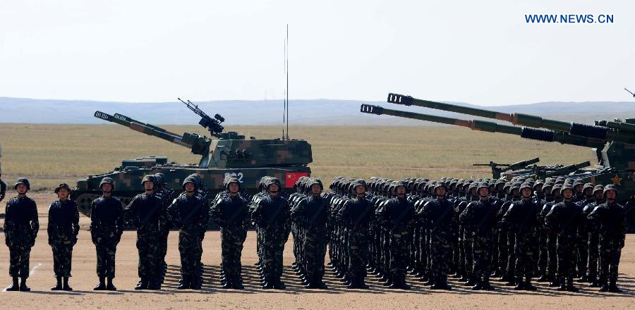Chinese soldiers attend the closing ceremony of the Peace Mission - 2014 military drill in Zhurihe, Inner Mongolia, north China, Aug. 29, 2014. The drill, involving over 7,000 personnel from China, Russia, Kazakhstan, Kyrgyzstan and Tajikistan, member countries of the Shanghai Cooperation Organization (SCO), and expected to hone multilateral decision-making, sharpen joint anti-terror efforts and boost intelligence sharing to ensure regional peace and stability, ended here Friday along with the first edition of the SCO military tattoo. (Xinhua/Zhang Ling)