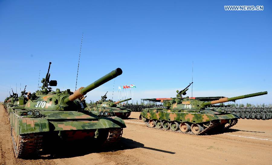 Chinese military vehicles attend the closing ceremony of the Peace Mission - 2014 military drill in Zhurihe, Inner Mongolia, north China, Aug. 29, 2014. The drill, involving over 7,000 personnel from China, Russia, Kazakhstan, Kyrgyzstan and Tajikistan, member countries of the Shanghai Cooperation Organization (SCO), and expected to hone multilateral decision-making, sharpen joint anti-terror efforts and boost intelligence sharing to ensure regional peace and stability, ended here Friday along with the first edition of the SCO military tattoo. (Xinhua/Zhang Ling)