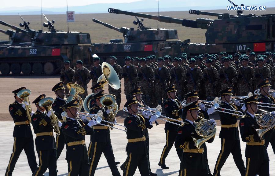 A Chinese military band perform during the closing ceremony of the Peace Mission - 2014 military drill in Zhurihe, Inner Mongolia, north China, Aug. 29, 2014. The drill, involving over 7,000 personnel from China, Russia, Kazakhstan, Kyrgyzstan and Tajikistan, member countries of the Shanghai Cooperation Organization (SCO), and expected to hone multilateral decision-making, sharpen joint anti-terror efforts and boost intelligence sharing to ensure regional peace and stability, ended here Friday along with the first edition of the SCO military tattoo. (Xinhua/Zhang Ling)