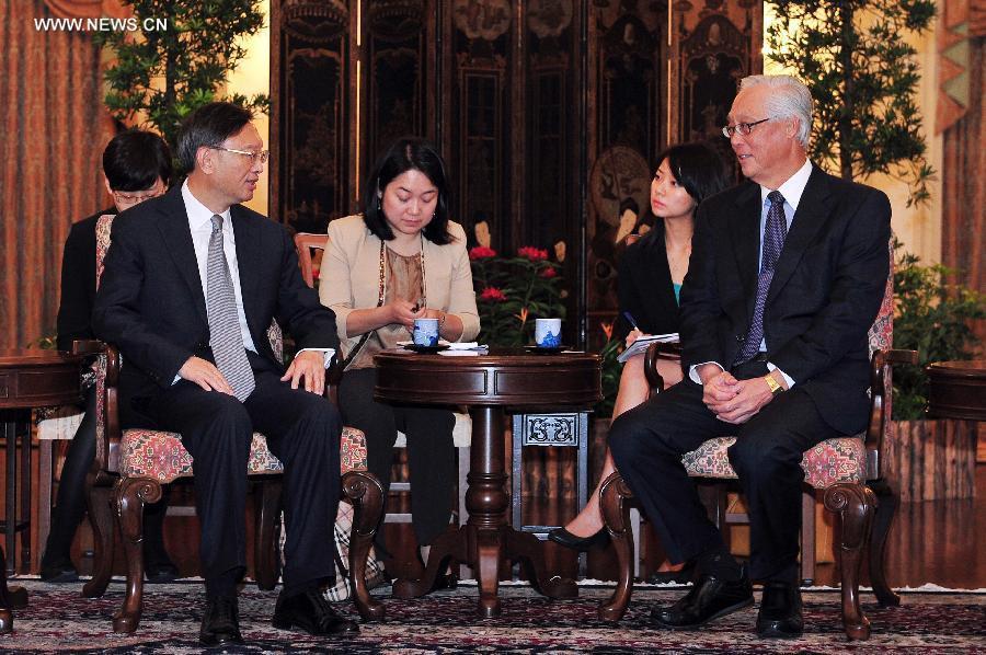 Singapore' s Emeritus Senior Minister Goh Chok Tong (R) meets with China' s State Councillor Yang Jiechi at Singapore' s Istana on Aug 29, 2014. Yang Jiechi is on a three-day official visit in Singapore. (Xinhua/Then Chih Wey)