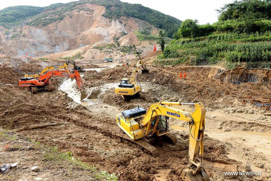 Excavators work at the site where a landslide occurred in Yingping Village, Fuquan City of southwest China's Guizhou Province, Aug. 31, 2014. Rescuers combing the rubble at the landslide site here retrieved two more bodies Sunday morning, bringing the total death toll in the disaster to 22, rescue authorities said. Twenty-two others have been injured and one has remained missing as of 10 a.m., four days after a 600-meter-high knoll broke free and swept into the village. (Xinhua/Wu Rubo)