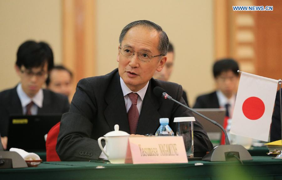 Yasumasa Nagamine, Japanese deputy Foreign Minister, speaks during the opening ceremony of the fifth round of China-Japan-Korea FTA negotiations in Beijing, capital of China, Sept. 1, 2014. The fifth round of trilateral talks on the free trade agreement (FTA) among China, Japan and South Korea started on Monday and will last till Sept. 5th. (Xinhua/Xing Guangli)
