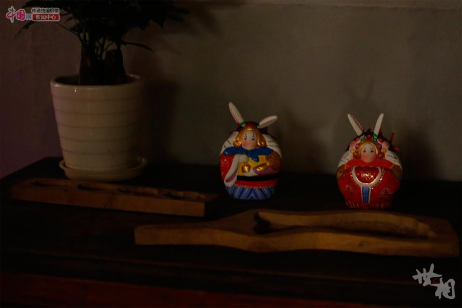 Old Beijing toy 'rabbit god' and the mold of making 'noodlefish', a traditional Chinese dish are displayed in the bar. (china.org.cn/ Zhang Hao)