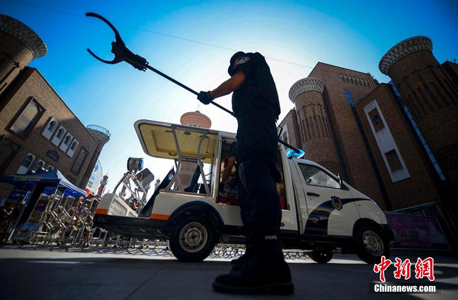 A new type of anti-terrorism electric patrol car is seen on street in Urumqi, capital of northwest China's Xinjiang Uygur Autonomous Region on Aug. 28, 2014. The electric-powered car is installed with advanced equipment such as police searchlight and real-time monitoring device. (Photo/ Liu Xin)