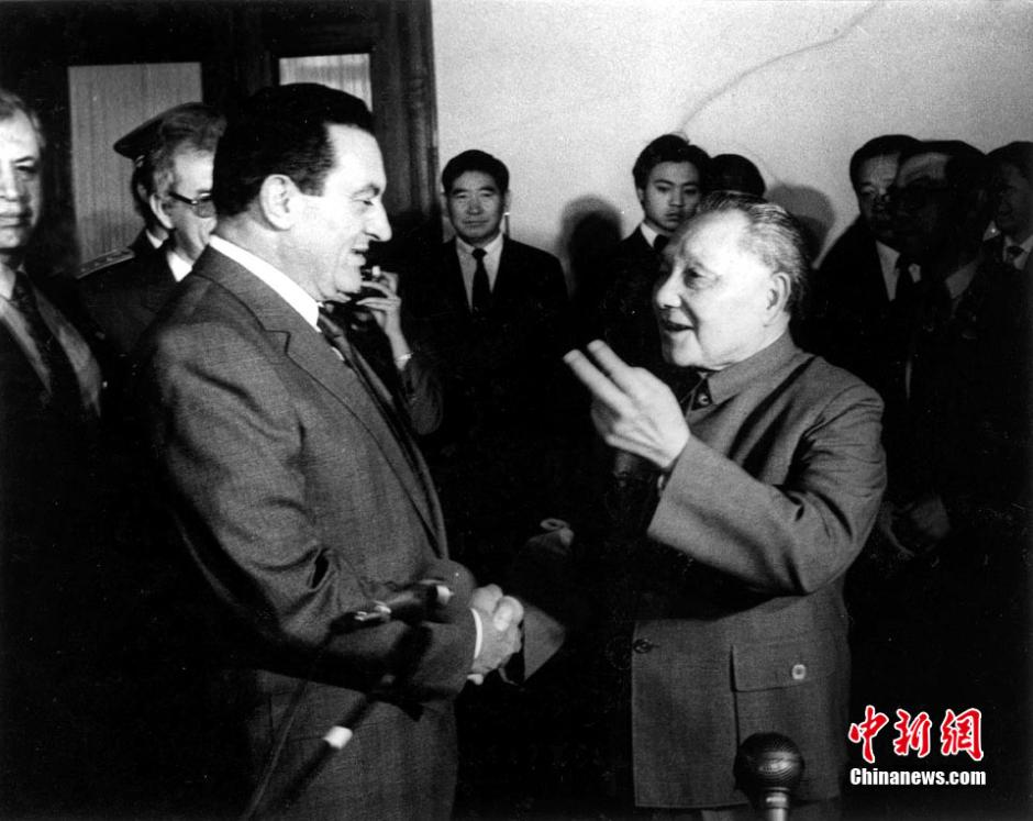 Deng Xiaoping, after being absent for a long time, meets with visiting Egyptian President Hosni Mubarak on the morning of May 13, 1990. (CNS/Zhang Ping)