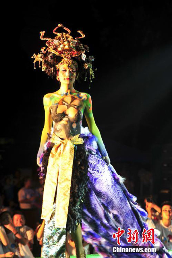 Models show makeup designs on the runway. (China News Service/ Zhang Yong)