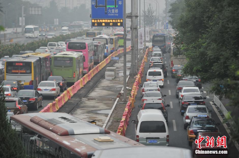Photo taken on Sept. 1, 2014 shows road congestion in Beijing. Beijing has been urged to use public transport and shun peak hours in September as the Chinese capital braces for the gridlock that comes with the beginning of the school year. At the same time, Beijing's traffic regulator, which has called this month "the most congested" of this year, has forecast that the city's major roads will be congested from 6:45 a.m. on Monday, with the traffic only dying down around noon. (China News Service /Jin Shuo)