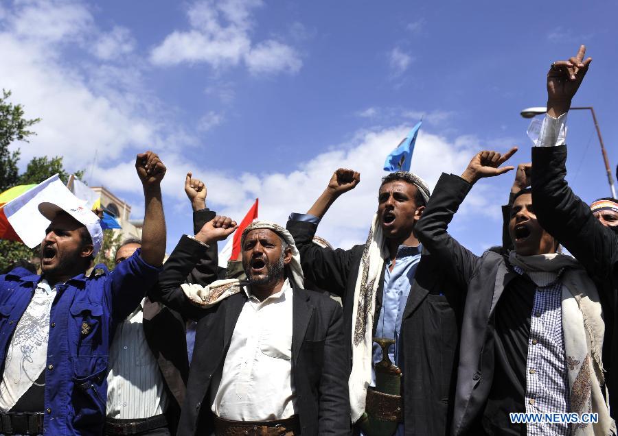 Yemeni protestors shout slogans during a demonstration in Sanaa, Yemen, on Sept. 1, 2014. Thousands of supporters of the Shiite Houthi group rallied in Sanaa, demanding the resignation of the government and broader political partnership. (Xinhua/Mohammed Mohammed)