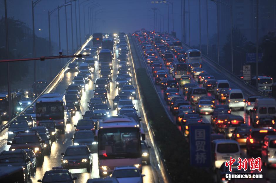 Rainfall worsened Beijing's traffic congestion during evening peak hours on Sept. 1 2014. Beijing entered its most congested month on Monday, as the ubiquitous "school run" clogged the city thoroughfares on the first day of the new semester. Travel for the upcoming Mid-Autumn Festival and National Day holidays is also expected to worsen traffic jams, which are a common sight in Beijing. (China News Service /Jin Shuo)