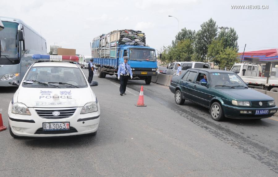 | Police check vehicles at the way out of Harbin, capital of northeast China's Heilongjiang Province, Sept. 2, 2014. Three inmates are at large after killing a guard in a detention center in Yanshou County near Harbin early on Tuesday. Police in Heilongjiang said anyone who provides tips leading to the capture of an escapee will receive 100,000 yuan (about 16,200 U.S. dollars). (Xinhua/Liang Shubin) |